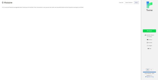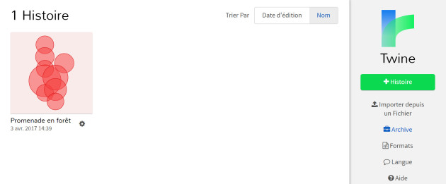 En cliquant sur "Archive", vous téléchargerez automatiquement un fichier html (encore) qui contiendra l'ensemble de vos histoires à importer également dans Twine.