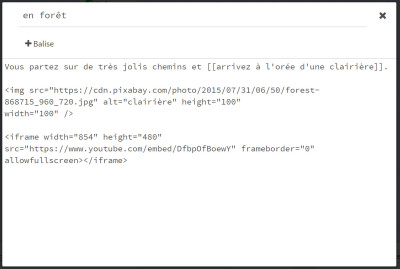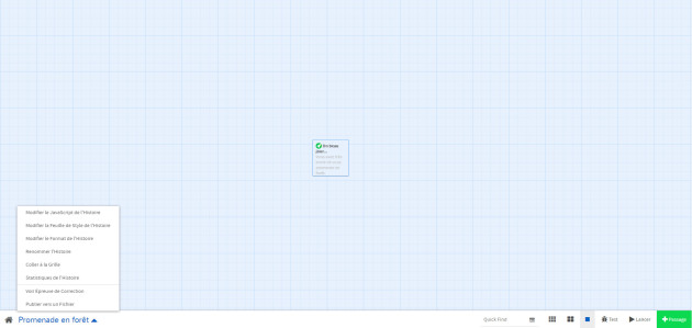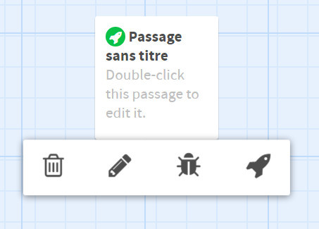 Lorsque vous passez la souris sur un passage, une barre d'icônes apparaît. De gauche à droite : supprimer le passage / Editer le passage / Tester l'histoire à partir de ce passage / Définir ce passage comme étant le point de départ de l'histoire.