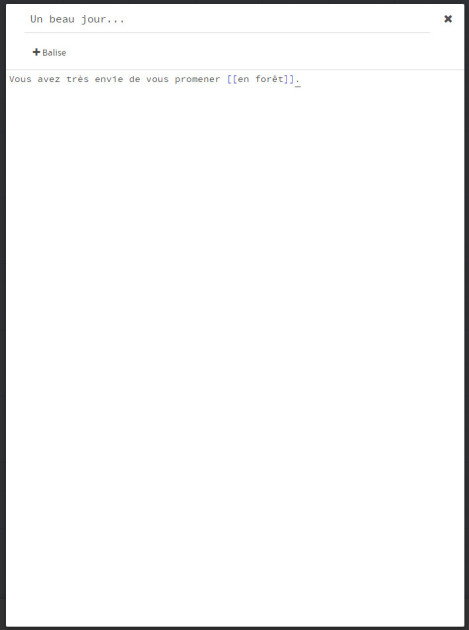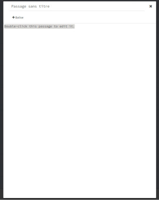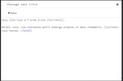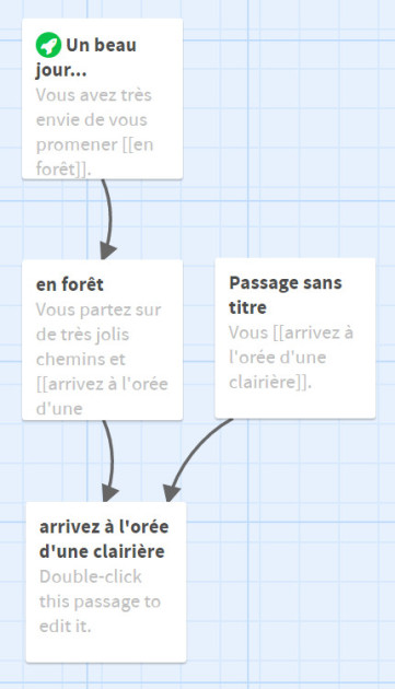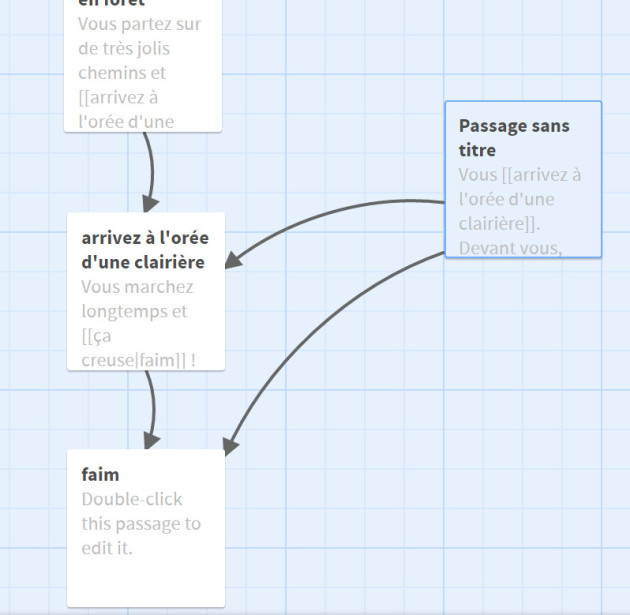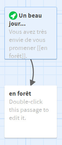 Pour créer un lien entre des passages dans Twine, il vous suffit de mettre des crochets [[ ]] là où vous souhaitez créer le lien vers le passage du même nom (voir ci-dessus). Si le passage vers lequel le lien renvoie n'existe pas encore, Twine le crée automatiquement. C'est facile ! (si si, essayez !)