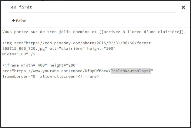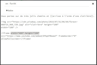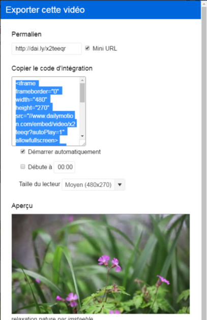 Ce qui est surligné en bleu sur la capture d'écran est le code d'intégration que vous devrez copier dans Twine. Attention ! Si vous souhaitez changer des options (telle que cocher "Démarrer automatiquement", ou choisir la taille de la vidéo), faites d'abord vos réglages, puis copiez-collez votre code d'intégration qui se sera mis à jour selon vos choix.