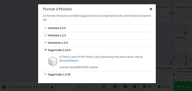 Cliquez sur "Modifier le format de l'histoire", et choisissez "Sugarcube 2"